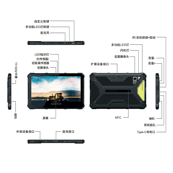 面向户外移动作业的5G三防平板。配备10.36英寸2K高清屏,搭载八核处理器与Android 14系统,5G全网通、PoC公网对讲,性能流畅。10700mAh大电池支持长时间工作与OTG反向充电。产品通过IP68认证,坚固耐用,支持宽温运行。配置6Pin工业内窥镜接口与8Pin扩展音箱接口,配合NFC巡检与1100流明多功能露营灯,专为现场巡检、数据采集及工业检测等移动工作站场景设计